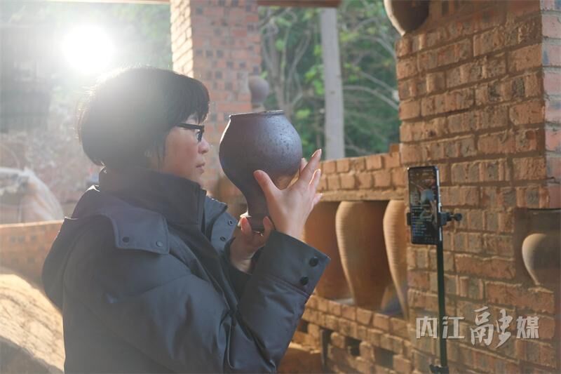 雖然工作在銀行,但她的“辦公室”遍布隆昌各大企業(yè)、農(nóng)場,而梨園村利民土陶加工坊就是她的辦公場所之一。在她的鏡頭下,窯門緩緩打開,滾滾熱浪裹挾著煙火氣撲面而來。