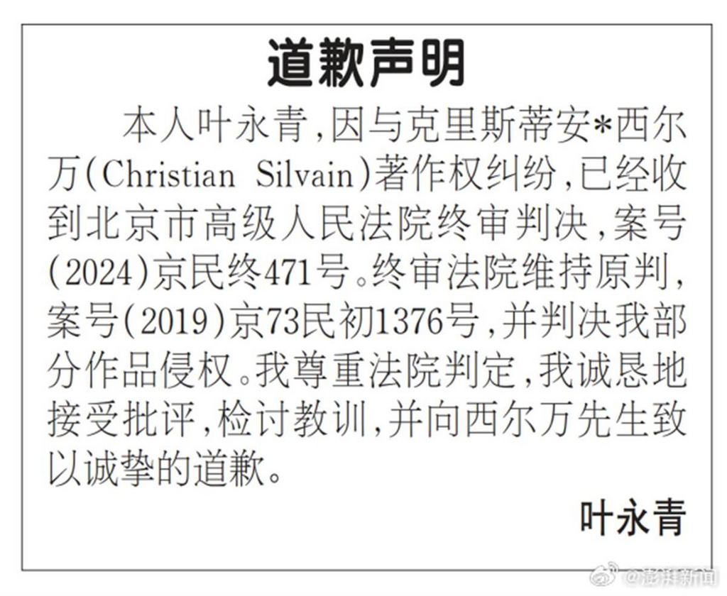 ·四川美院退休教授葉永青承認抄襲,道歉并被判賠500萬。