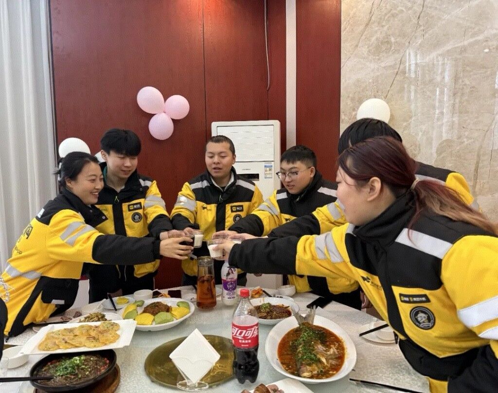 外賣騎手閆浩,從吉林遠(yuǎn)赴成都打拼,這份工作是他的第一份正式職業(yè)?!捌綍r(shí)同事們都像哥哥姐姐一樣照顧我,今天和大家一起吃團(tuán)年飯,感覺(jué)特別熱鬧?!彼f(shuō),盡管遠(yuǎn)離家鄉(xiāng),但在這座城市,讓他感受到了家的溫暖與歸屬感。