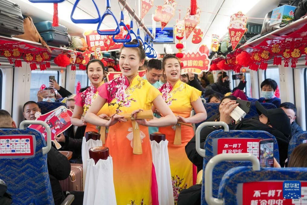 “臨近過年,我們在列車上也為旅客準備了特色表演。”中國鐵路成都局集團有限公司成都客運段列車長李志成介紹,“我們這趟列車從成都東站始發(fā),停靠天府機場、自貢、瀘州,列車定員216人,只有4節(jié)車廂,被很多旅客昵稱為‘小火車’?!?/p>