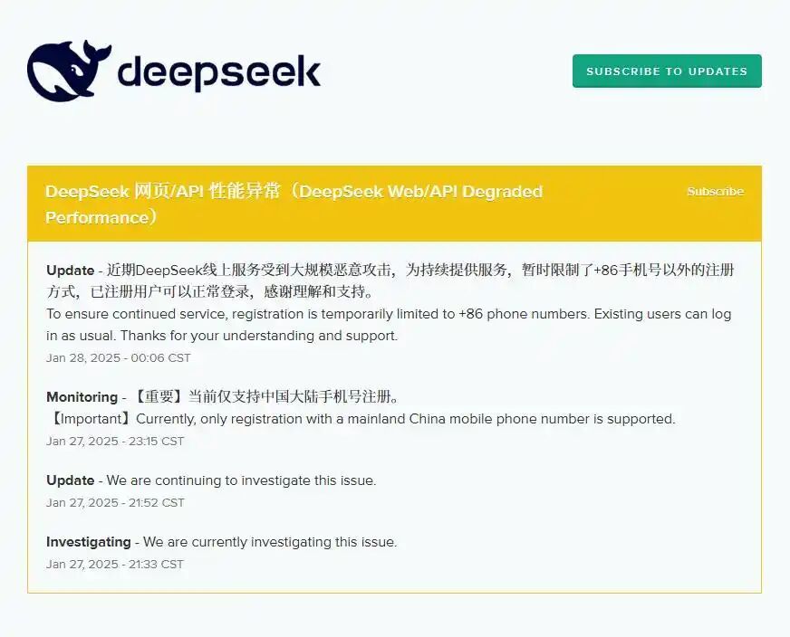 1月28日,DeepSeek官網(wǎng)的服務狀態(tài)頁面顯示:近期DeepSeek線上服務受到大規(guī)模惡意攻擊,為持續(xù)提供服務,暫時限制了+86手機號以外的注冊方式,已注冊用戶可以正常登錄,感謝理解和支持。