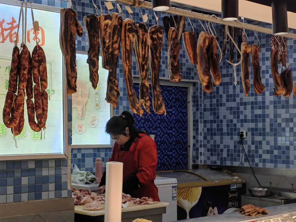 市民李女士每年都會來這里灌香腸,或買肉回去腌制?!芭D肉和香腸的制作,不只是一種技藝,更是情感的傳遞。每年除夕,一家人團(tuán)團(tuán)圓圓地吃著臘肉和香腸,是我們最溫暖的年味記憶?!彼锌?。