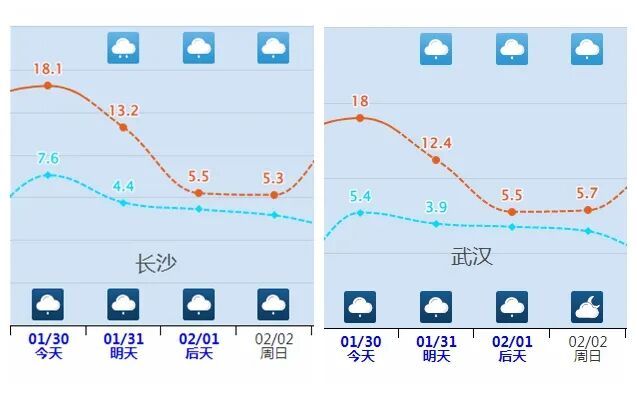 像武漢、長(zhǎng)沙,今天最高氣溫超過(guò)18℃,2月1日至2日最高氣溫都將降至5℃左右,或刷新今冬以來(lái)新低。