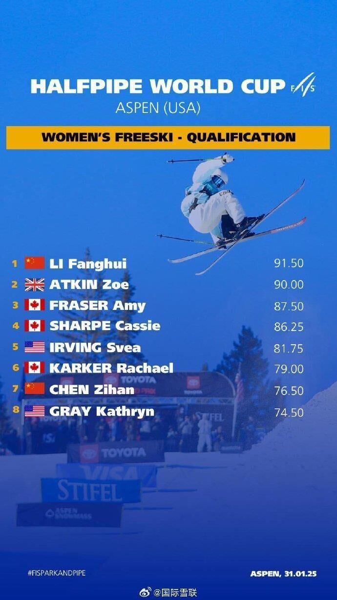 自由式滑雪U型場(chǎng)地世界杯阿斯本站資格賽女子組比賽時(shí)間(北京時(shí)間)為2月1日凌晨。谷愛凌因傷缺席本站比賽,陳紫菡和李方慧攜手晉級(jí)決賽。