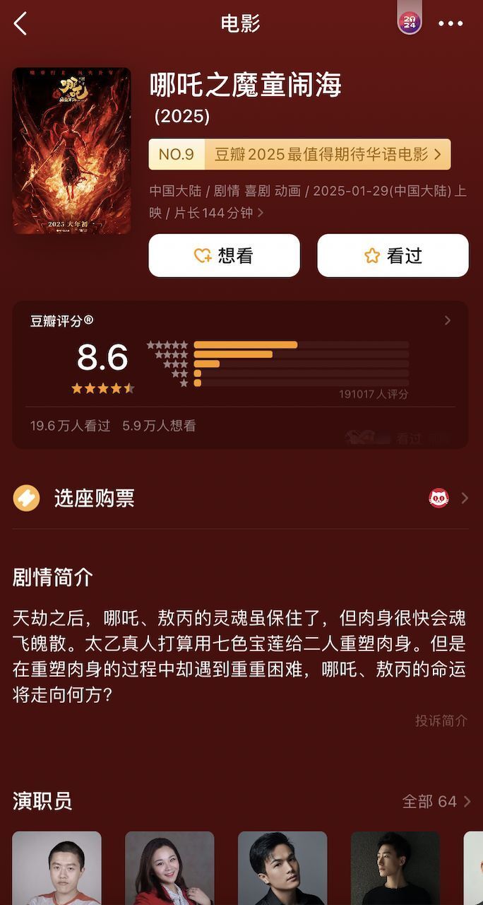 與此同時(shí),備受影迷信任的豆瓣平臺(tái)也及時(shí)為春節(jié)檔開分,《哪吒之魔童鬧?!帆@得了8.6分的高度評(píng)價(jià),遠(yuǎn)超檔期內(nèi)其他對(duì)手,位居2025年春節(jié)檔豆瓣評(píng)分第一。