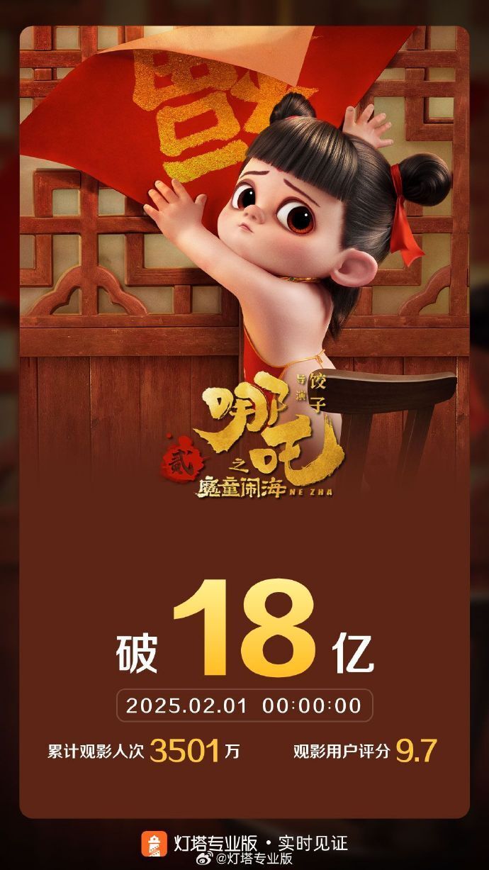 據(jù)燈塔專業(yè)版實(shí)時(shí)數(shù)據(jù),截至2月1日0時(shí)0分,影片《哪吒之魔童鬧海》票房突破18億,位列春節(jié)檔第一。