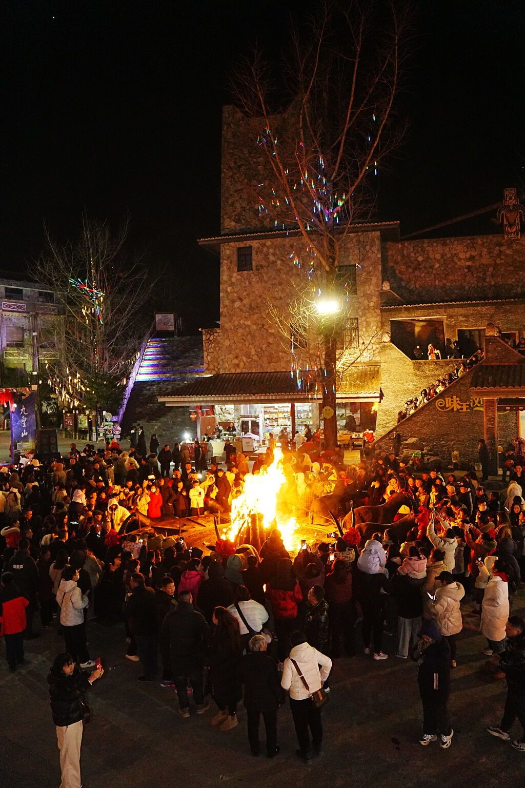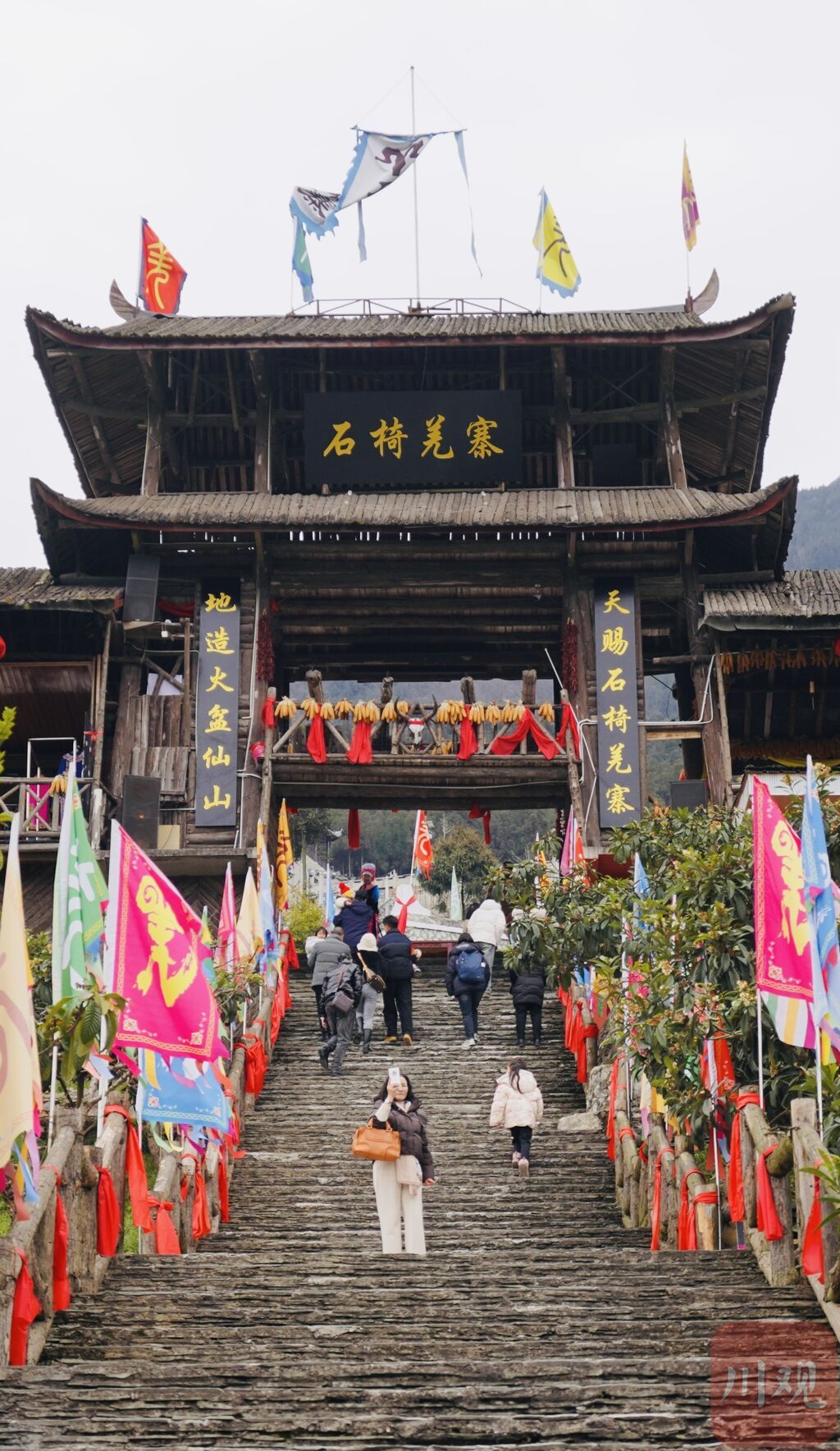 隨著太陽升高,羌寨廣場里的人越來越多,臘肉香腸的攤位前很快擠滿了游客。據(jù)介紹,截至當(dāng)天,春節(jié)假期石椅村已接待游客近萬人。