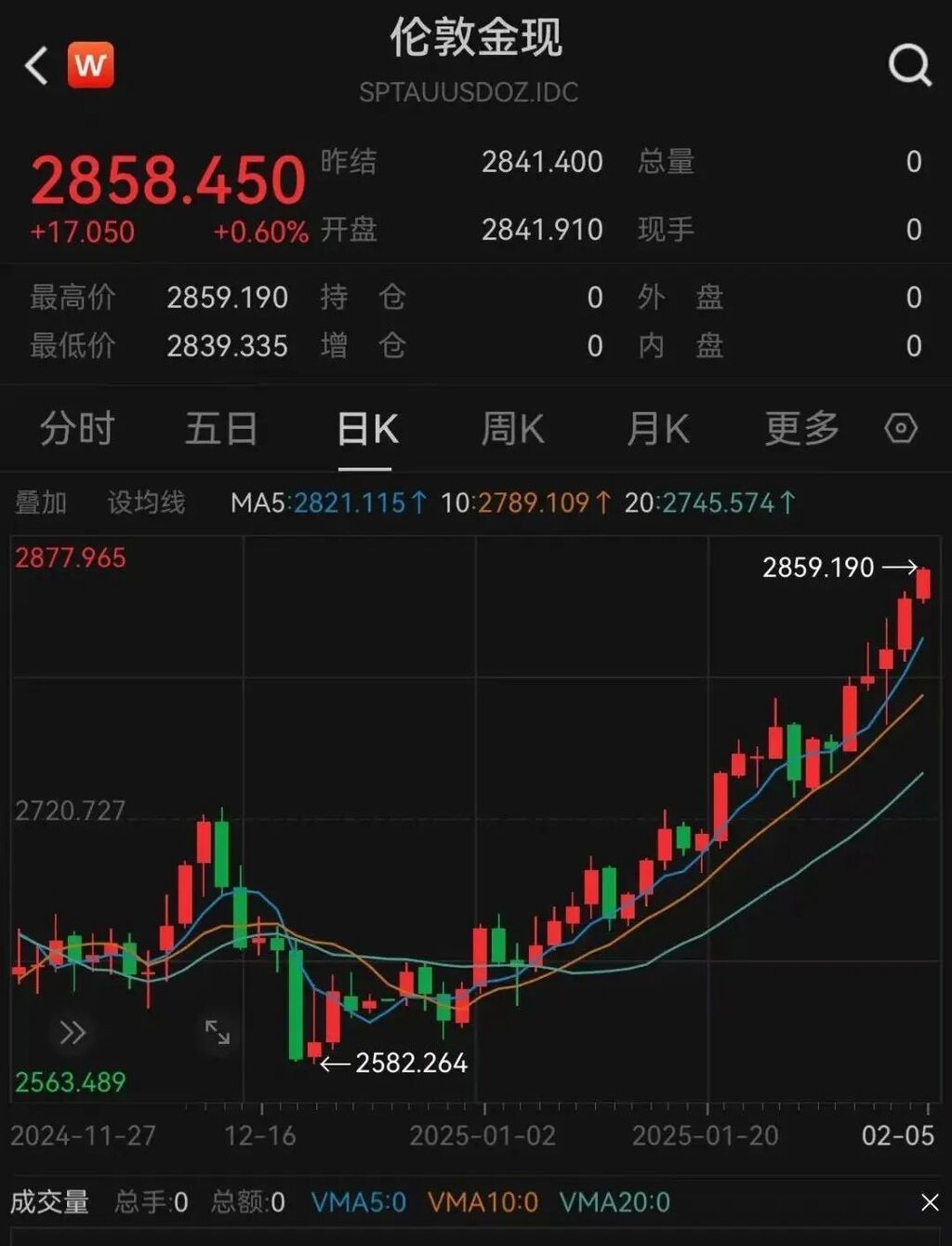 據(jù)報(bào)道,2月5日,現(xiàn)貨黃金再創(chuàng)新紀(jì)錄,摸高至2859美元/盎司。COMEX黃金也在盤中創(chuàng)下歷史新高,最高漲至2886美元/盎司。