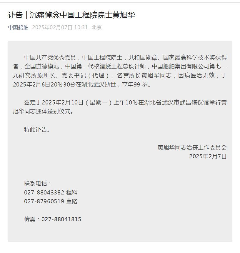 中國(guó)共產(chǎn)黨優(yōu)秀黨員,中國(guó)工程院院士,共和國(guó)勛章、國(guó)家最高科學(xué)技術(shù)獎(jiǎng)獲得者,全國(guó)道德模范,中國(guó)第一代核潛艇工程總設(shè)計(jì)師,中國(guó)船舶集團(tuán)有限公司第七一九研究所原所長(zhǎng)、黨委書記(代理)、名譽(yù)所長(zhǎng)黃旭華同志,因病醫(yī)治無(wú)效,于2025年2月6日20時(shí)30分在湖北武漢逝世,享年99歲。