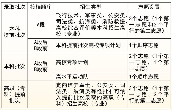 從上表可以看出:普通類本科提前批次A段、高校專項(xiàng)計(jì)劃、高水平運(yùn)動(dòng)隊(duì)、高職(專科)提前批次等實(shí)行順序志愿投檔。