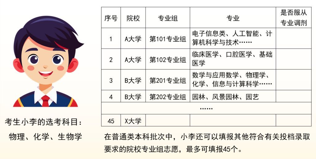 首先,選擇符合自己的選考科目要求的院校專業(yè)組;
