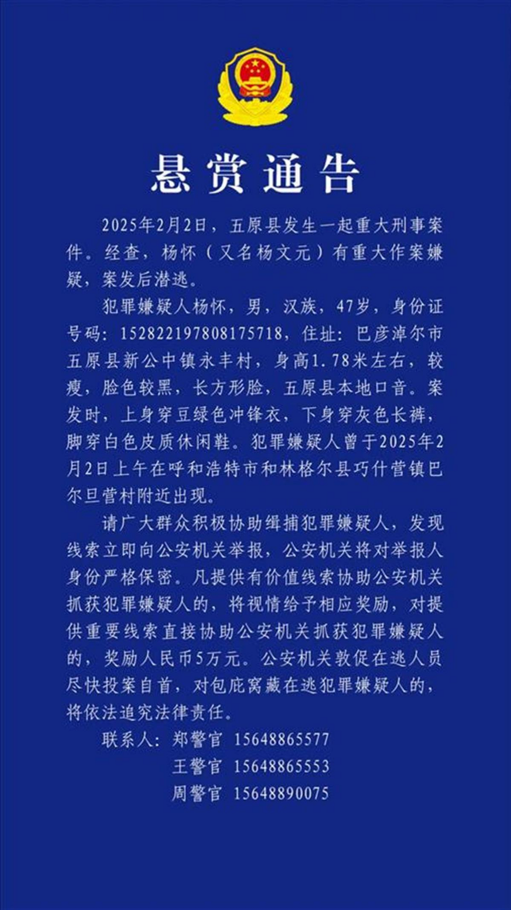 ·內(nèi)蒙古一地發(fā)生重大刑案,警方懸賞5萬元緝兇。