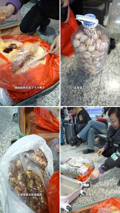 前往成都務(wù)工的雷從英,打開滿滿當當?shù)男欣?,向記者展示家人為其準備的家鄉(xiāng)味道。100多個母親親手裝好的土雞蛋,近10只打理好的鴨子,還有姐姐精心準備的香腸、黃粑,母親種的豌豆尖、血皮菜、干辣椒…… 每一樣特產(chǎn),都是家人愛的饋贈。