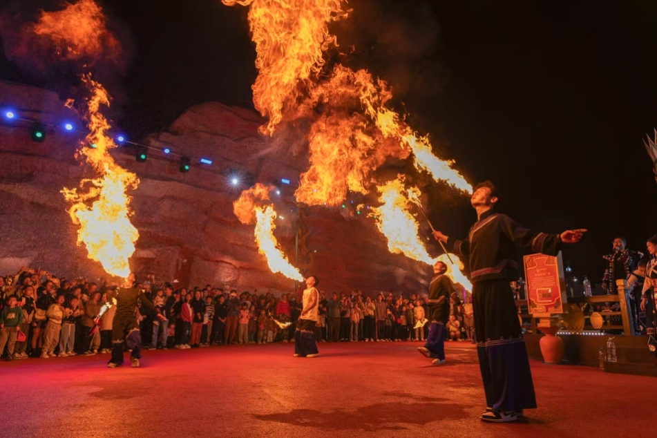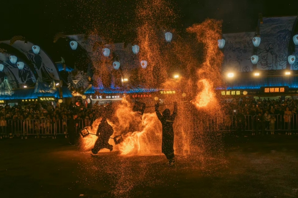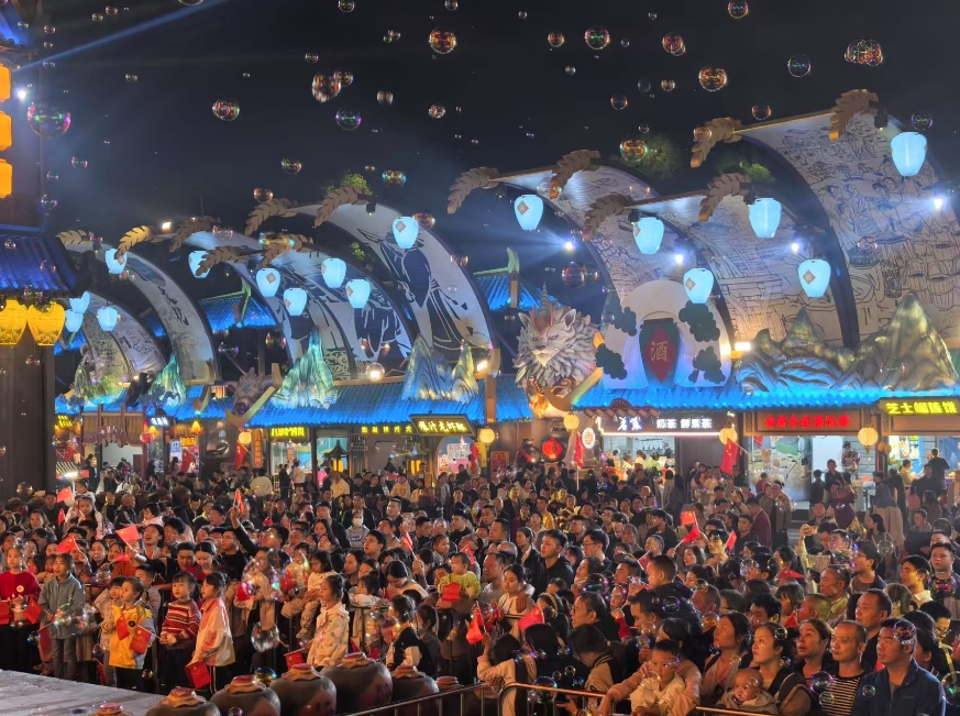 在瀘州山河明月·醉酒城,以酒文化為核心的文旅融合新型夜間消費場景,融合了瀘州酒文化、人文風(fēng)情、民俗文化以及非遺傳承等多元要素,現(xiàn)場還推出了青蛇大巡游、蛇年不倒翁、靈蛇竹舞、篝火狂歡等20余個循環(huán)展演節(jié)目,冰雪大世界、非遺火壺表演等環(huán)節(jié)一站式打卡。