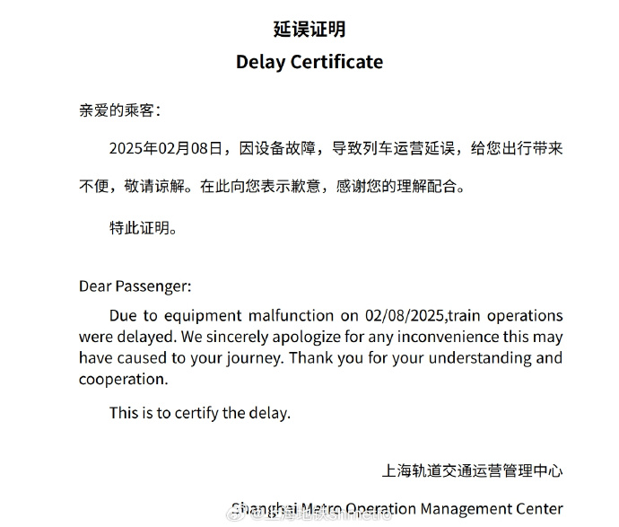 ·2月8日早晨,上海地鐵浦江線發(fā)生故障導(dǎo)致列車(chē)運(yùn)營(yíng)延誤。上海地鐵發(fā)布致歉信,向受到影響的乘客提供電子延誤證明。