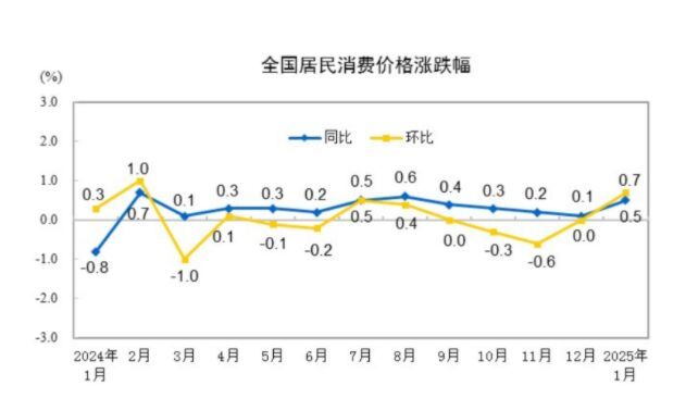 2025年1月份,全國(guó)居民消費(fèi)價(jià)格同比上漲0.5%。其中,城市上漲0.6%,農(nóng)村上漲0.3%;食品價(jià)格上漲0.4%,非食品價(jià)格上漲0.5%;消費(fèi)品價(jià)格上漲0.1%,服務(wù)價(jià)格上漲1.1%。
