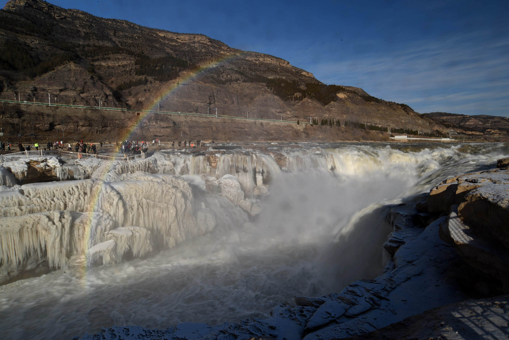受寒潮天氣影響,位于山西吉縣和陜西宜川縣交界的黃河壺口瀑布再次出現(xiàn)冰瀑飛虹景觀,吸引了眾多游客。