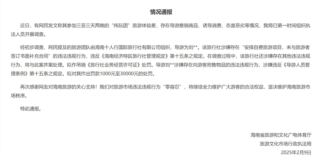 ·游客參加三亞純玩團(tuán)被導(dǎo)游誘導(dǎo)消費(fèi)續(xù):擬吊銷旅行社許可證。