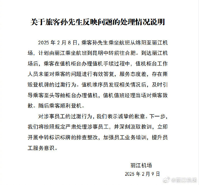 ·麗江機(jī)場(chǎng)回應(yīng)值機(jī)員撕毀頭等艙乘客登機(jī)牌:將嚴(yán)肅處理涉事員工。