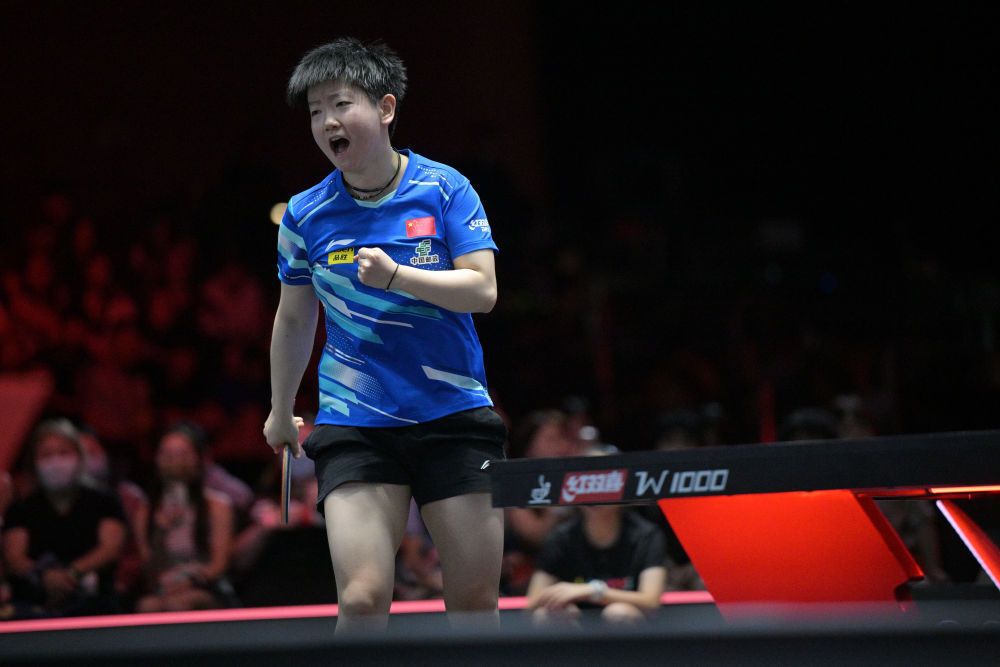 前一個比賽日結(jié)束后,國乒提前包攬本站賽事五項冠軍。面對首次打入大滿貫賽單打決賽的蒯曼,孫穎莎以11:8先下一城。在蒯曼以11:9扳平局分后,孫穎莎完全掌控住了場上局面;她以11:7、11:5、11:6連勝三局,大比分4:1奪冠。這是孫穎莎的第三個WTT大滿貫賽單打冠軍,也是她第14個WTT系列賽事單打冠軍。