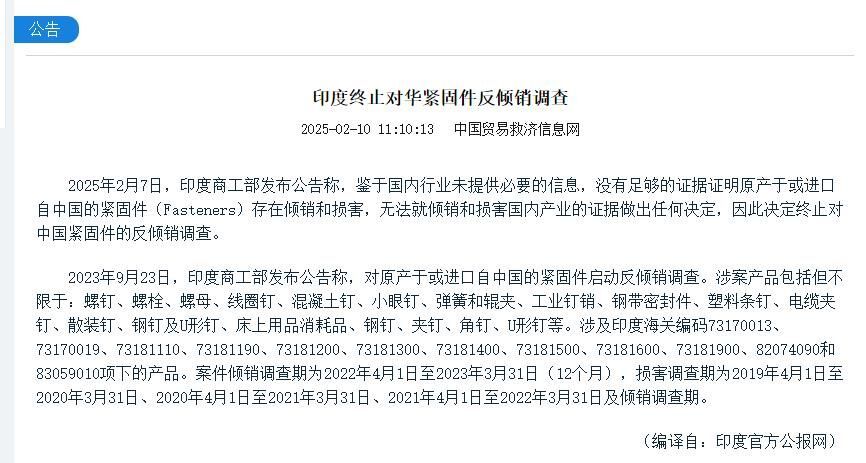 央視網(wǎng)消息:據(jù)中國貿(mào)易救濟信息網(wǎng),2025年2月7日,印度商工部發(fā)布公告稱,鑒于國內(nèi)行業(yè)未提供必要的信息,沒有足夠的證據(jù)證明原產(chǎn)于或進口自中國的緊固件(Fasteners)存在傾銷和損害,無法就傾銷和損害國內(nèi)產(chǎn)業(yè)的證據(jù)做出任何決定,因此決定終止對中國緊固件的反傾銷調(diào)查。