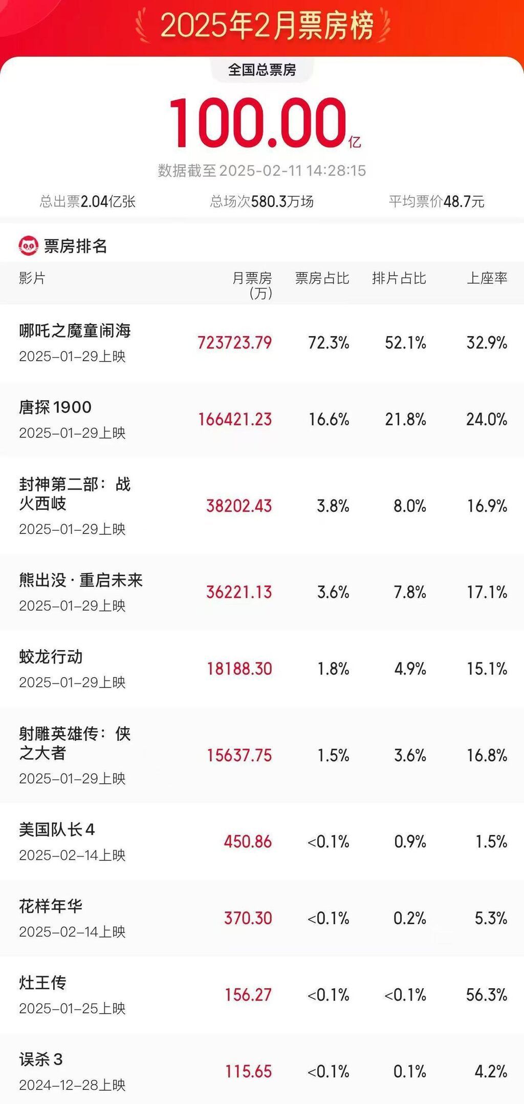 據(jù)網(wǎng)絡(luò)平臺數(shù)據(jù),2025年2月11日14時28分,2025年2月票房(含預(yù)售)破100億,暫列單月大盤票房榜第7位。