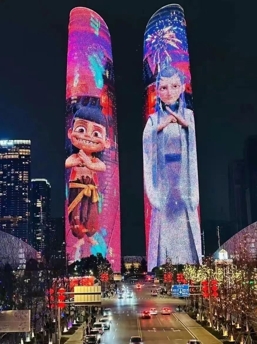 近期,成都天府雙塔夜間燈光秀特別加入哪吒、敖丙拜年動畫小彩蛋,為市民和游客提供了更多打卡樂趣。在正月十五元宵節(jié),交子大道還將舉行“哪吒來拜年”相關(guān)主題活動。屆時,“哪吒”將在天府雙塔上給大家送上元宵節(jié)祝福。