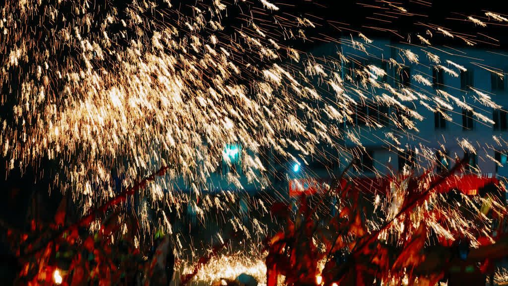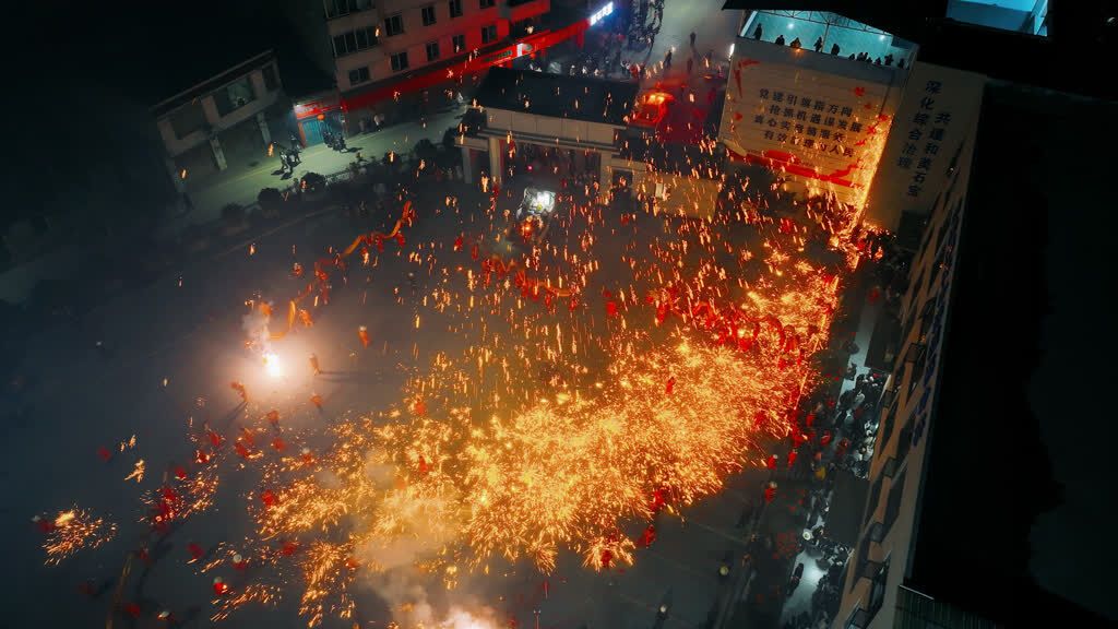 夜幕低垂,燈火璀璨,耍龍燈活動(dòng)在石寶鎮(zhèn)的大街小巷熱鬧上演。四條栩栩如生的“長(zhǎng)龍”在四方看客的矚目下,威風(fēng)凜凜地排成四列,開(kāi)啟了石寶人一年一度的龍燈民俗文化盛宴。而在這盛大的慶典之中,一項(xiàng)古老而獨(dú)特的技藝——打鐵花,更為這場(chǎng)活動(dòng)增添了無(wú)盡的魅力與神秘。
