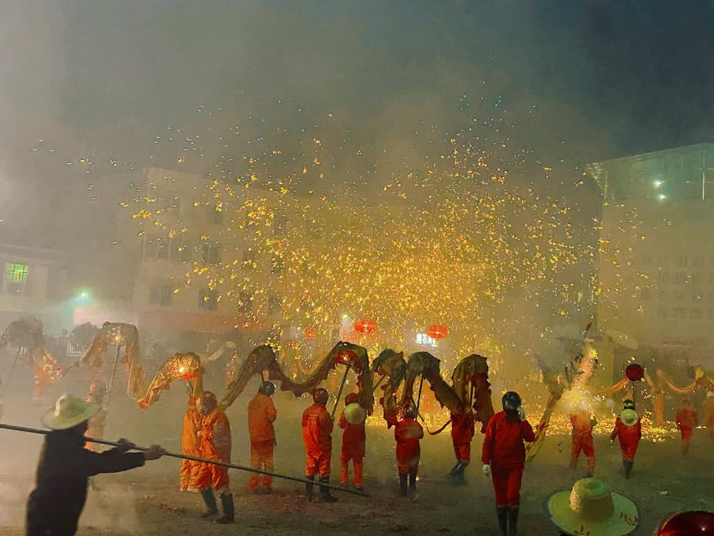 在一戶戶農(nóng)家戶門(mén)前,巨龍搖頭擺尾,做出各種精彩動(dòng)作,或“點(diǎn)頭”祝福,或繞柱“祈福”,將好運(yùn)與喜慶送進(jìn)千家萬(wàn)戶。而鐵花則如同璀璨的星辰,為每一戶人家都送去了光明與希望。每個(gè)人的臉上都洋溢著新春的喜悅,鄰里鄉(xiāng)親們的心在這歡樂(lè)氛圍中緊緊相連,沿途的居民們目不暇接,喝彩聲與掌聲此起彼伏。