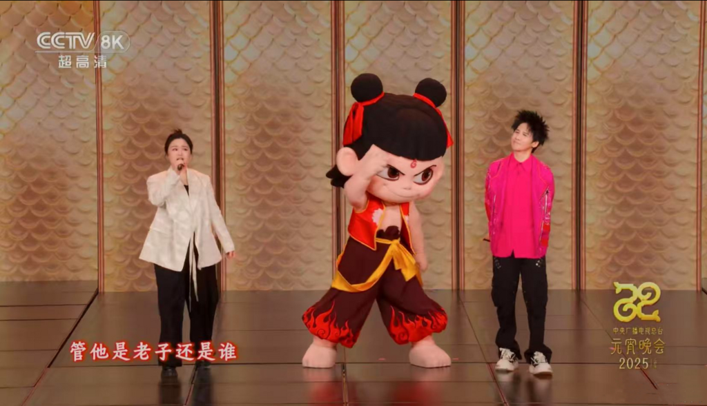 “金霞萬丈錦綾飄小小少年勢氣高?!遍_場歌舞后的首個節(jié)目便將鏡頭對準了正在熱映的“成都造”動畫巨制《哪吒之魔童鬧?!贰9?jié)目中,古靈精怪的哪吒和俊秀的敖丙人偶亮相舞臺,大張偉聯(lián)手電影中哪吒的配音演員、四川電影電視學院教師呂艷婷,帶領(lǐng)萌娃小哪吒們獻上歌舞《哪吒鬧元宵》,可愛爆棚。