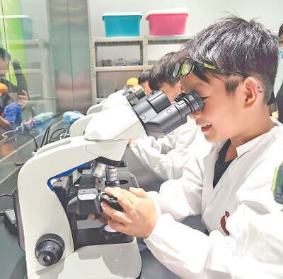 小朋友在觀察動物實驗樣本。