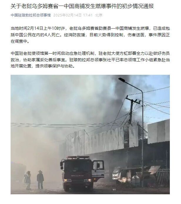 據(jù)中國駐瑯勃拉邦總領(lǐng)事館消息,當?shù)貢r間2月14日上午10時許,老撾烏多姆賽省勐賽縣一中國商鋪發(fā)生燃爆,已造成包括中國公民在內(nèi)的4人死亡。經(jīng)消防救援,目前火勢得到控制,傷者送醫(yī),事件原因正在調(diào)查中。