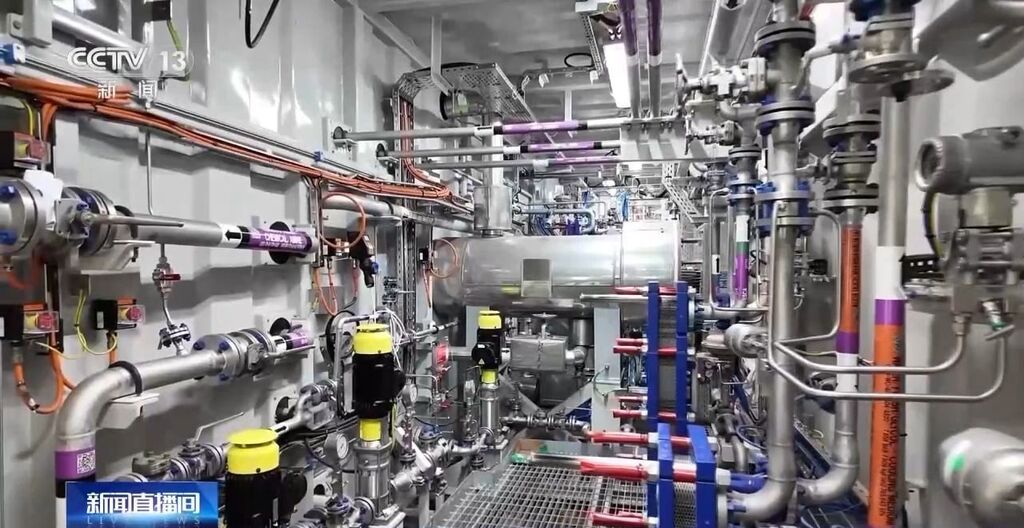 上海中遠海運重工有限公司高級項目經(jīng)理 徐曉華:這個高塔其實就是碳捕捉的一個收集和洗滌塔,貼著綠色標(biāo)簽的這個管路就是廢氣的入口。通過風(fēng)機把廢氣帶到洗滌塔里面,洗滌塔里有一些吸附劑,會把廢氣里面的碳氫化合物捕捉出來,這樣出去的廢氣就是碳排放量比較少的廢氣了。