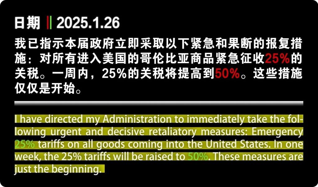 約一周后,特朗普宣布第一項(xiàng)關(guān)稅措施,針對(duì)哥倫比亞。