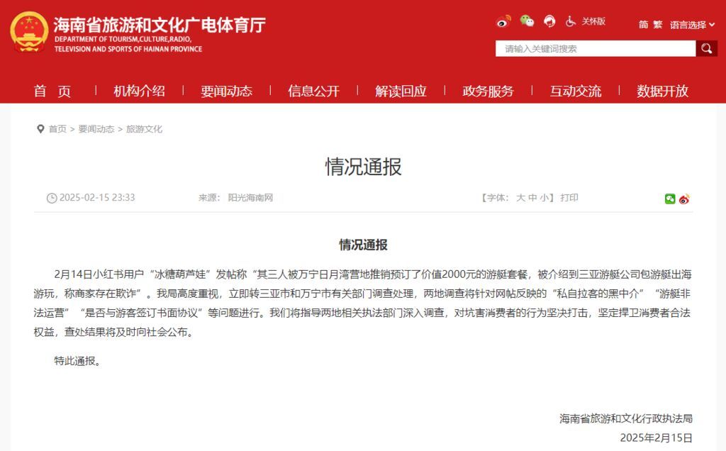央視網(wǎng)消息:2月14日小紅書用戶“冰糖葫蘆娃”發(fā)帖稱“其三人被萬寧日月灣營地推銷預(yù)訂了價值2000元的游艇套餐,被介紹到三亞游艇公司包游艇出海游玩,稱商家存在欺詐”。對此,海南省旅游和文化行政執(zhí)法局2月15日晚發(fā)布情況通報稱,該局高度重視,立即轉(zhuǎn)三亞市和萬寧市有關(guān)部門調(diào)查處理,兩地調(diào)查將針對網(wǎng)帖反映的“私自拉客的黑中介”“游艇非法運營”“是否與游客簽訂書面協(xié)議”等問題進行。海南省旅游和文化行政執(zhí)法局表示,將指導(dǎo)兩地相關(guān)執(zhí)法部門深入調(diào)查,對坑害消費者的行為堅決打擊,堅定捍衛(wèi)消費者合法權(quán)益,查處結(jié)果將及時向社會公布。
