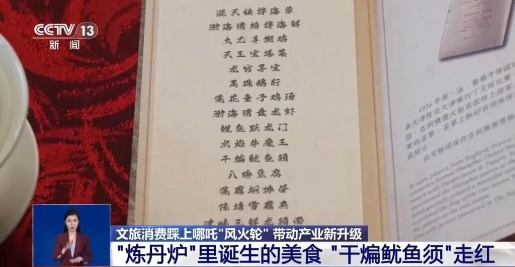 在天津這家酒店的餐廳里,記者看到一份新鮮出爐的“哪吒”菜譜:“太乙手撕雞”“混天綾拌海草”……在這當中,最受食客歡迎的是天津特色菜“干煸魷魚須”,許多游客看到菜單,就會想到說天津話的章魚將軍被天元鼎烤熟的場景。