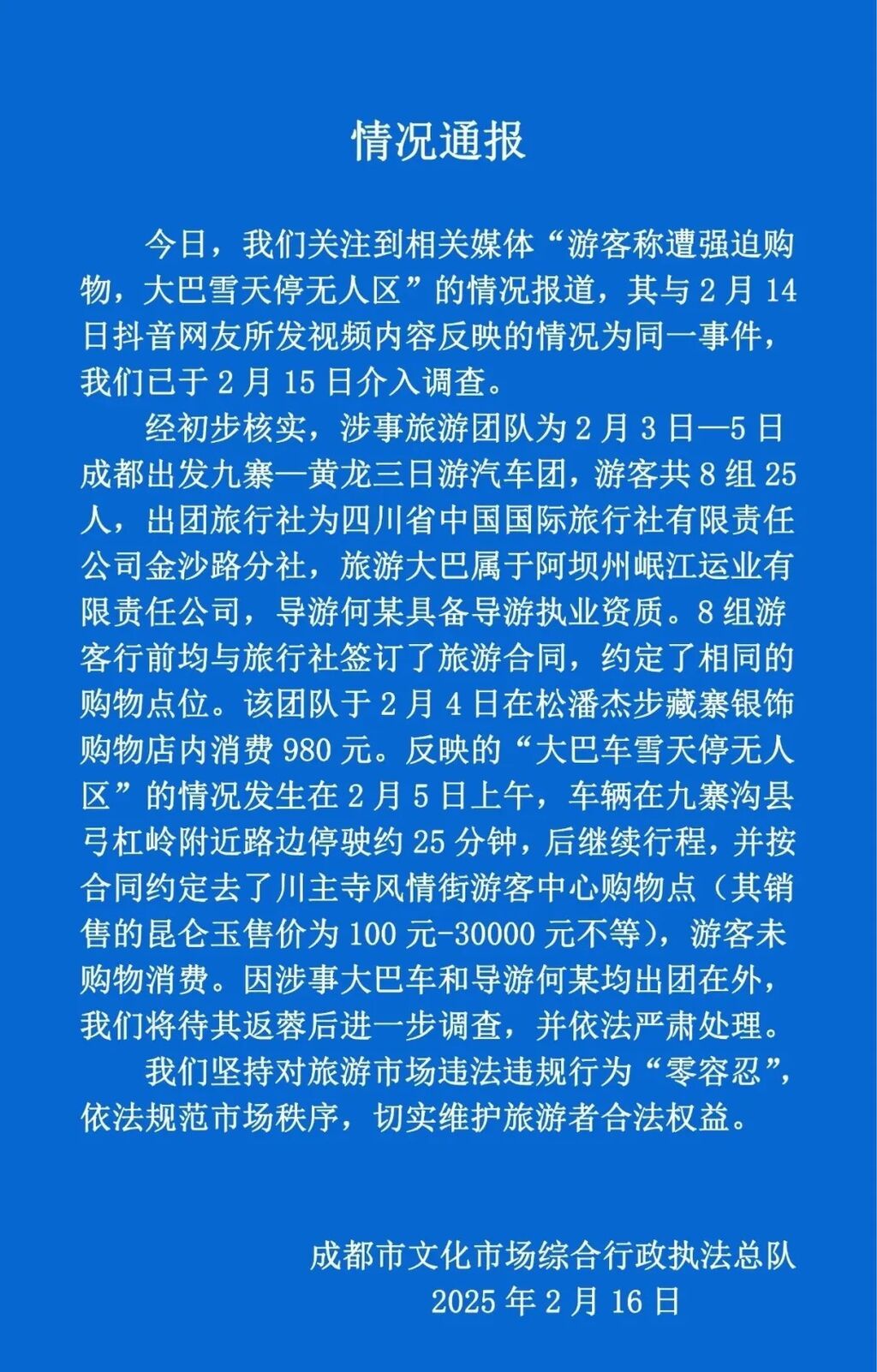 近日,有媒體報道“游客稱遭強(qiáng)迫購物,大巴雪天停無人區(qū)”,2月16日,成都市文化市場綜合行政執(zhí)法總隊(duì)發(fā)布情況通報如下: