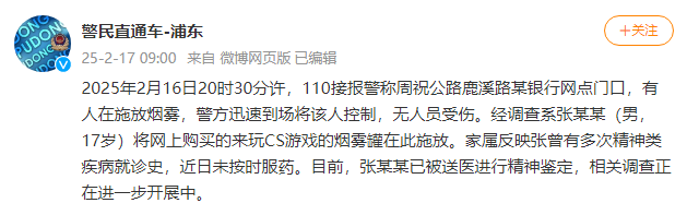 ·17歲男子在銀行門口施放CS游戲煙霧罐,上海浦東警方:已送醫(yī)進行精神鑒定。