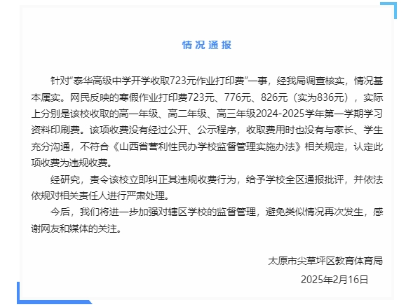 ·太原一中學收723元作業(yè)打印費,官方通報:違規(guī)收費,嚴肅處理。