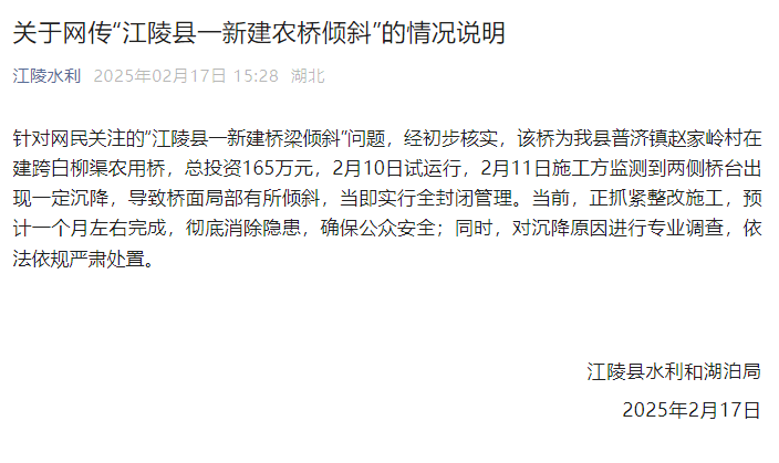 ·湖北荊州一新橋通車半天就“歪了”?官方發(fā)布情況說明。