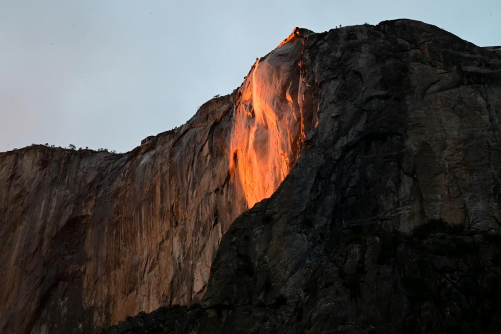 游客和攝影師聚集在美國加州約塞米蒂國家公園觀看“火瀑布”奇觀。每年二月份,夕陽照在瀑布上,讓水流發(fā)出金黃色光芒,如同火焰一般。