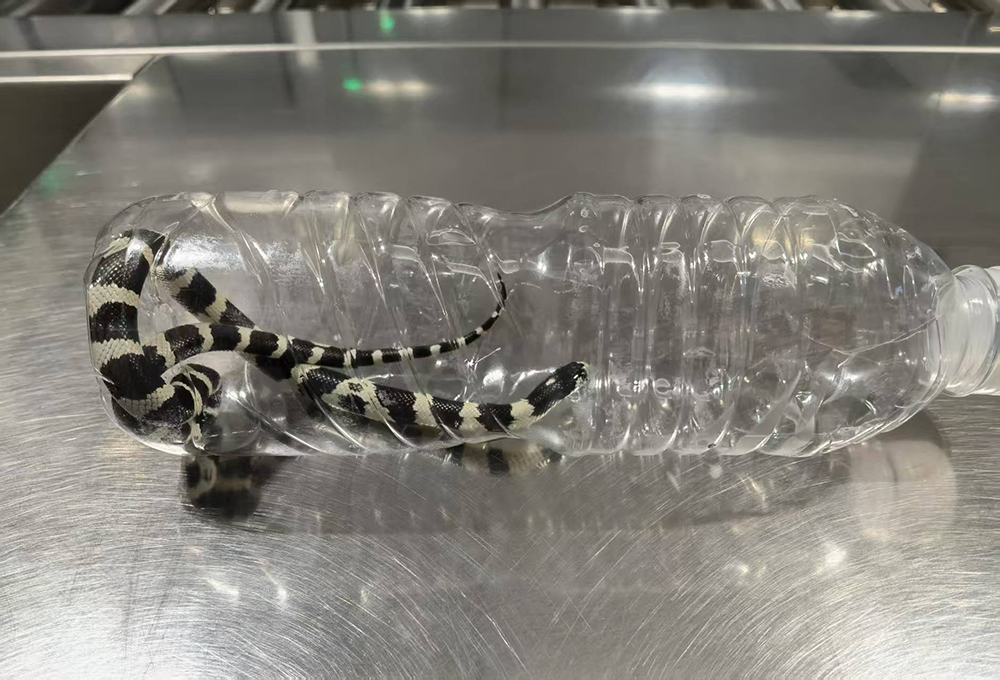·2月20日,杭州機(jī)場安檢查獲一名女性旅客將蛇藏于上衣口袋內(nèi)過檢。