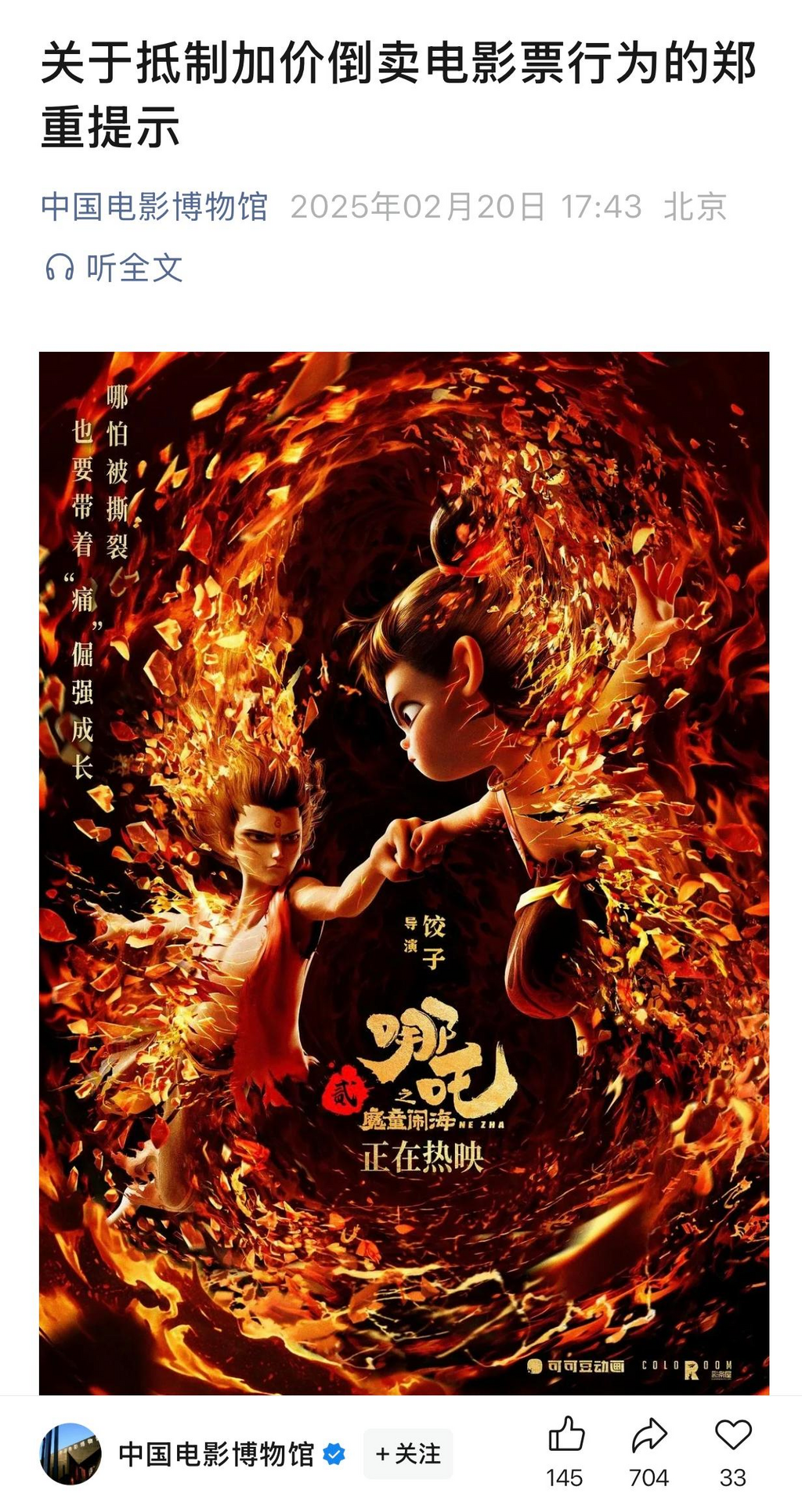 ·中國電影博物館回應(yīng)哪吒2被炒上千元:攜手抵制加價倒票行為。