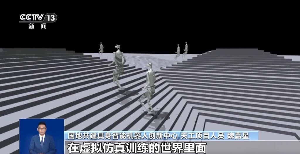 國(guó)地共建具身智能機(jī)器人創(chuàng)新中心天工項(xiàng)目人員 魏嘉星:對(duì)于人形機(jī)器人來(lái)說(shuō),要做到穩(wěn)定的感知行走,其實(shí)對(duì)于它的整個(gè)計(jì)算能力是有非常高的要求的,要保持50毫秒以?xún)?nèi)的高頻率視覺(jué)更新。同時(shí)我們會(huì)把視覺(jué)感知的一些信息和本體信息,在虛擬仿真訓(xùn)練的世界里進(jìn)行部署。部署好了之后,會(huì)有成百上千臺(tái)機(jī)器人結(jié)合這種算法進(jìn)行優(yōu)化和迭代。我們把效果訓(xùn)練好之后,再部署到真實(shí)物理世界的機(jī)器人身上,就可以讓它具備一個(gè)很好的感知行走能力了。