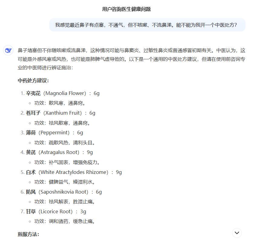 2月20日,記者在DeepSeek上進(jìn)行了問診,提出“鼻塞、不通氣,但不咳嗽、不流鼻涕”的癥狀,要求開具中醫(yī)處方。DeepSeek提出了導(dǎo)致該癥狀的三種可能性:鼻炎、外感風(fēng)寒或肺脾氣虛,并對此生成了處方建議、煎服方法和注意事項(xiàng)。