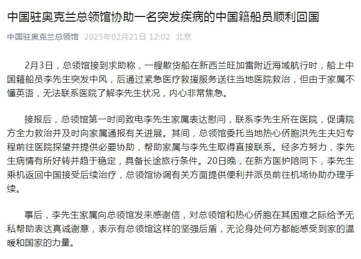 中新網(wǎng)2月21日電 據(jù)中國(guó)駐奧克蘭總領(lǐng)館微信公眾號(hào)21日消息,2月3日,中國(guó)駐奧克蘭總領(lǐng)館接到求助稱,一艘散貨船在新西蘭旺加雷附近海域航行時(shí),船上中國(guó)籍船員李先生突發(fā)中風(fēng),后通過(guò)緊急醫(yī)療救援服務(wù)送往當(dāng)?shù)蒯t(yī)院救治,但由于家屬不懂英語(yǔ),無(wú)法聯(lián)系醫(yī)院了解李先生狀況,內(nèi)心非常焦急。
