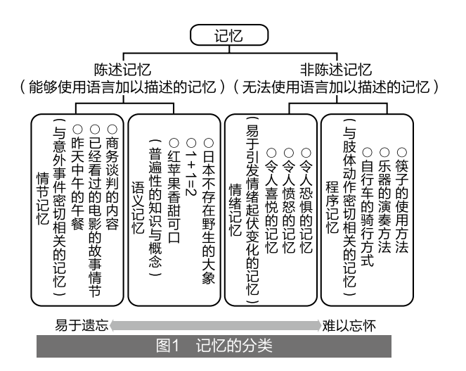記憶大致可分為“陳述記憶”(declarative memory)和“非陳述記憶”(nondeclarative memory)兩大類。能夠使用語言加以描述的記憶稱之為“陳述記憶”,難以使用語言加以描述的記憶則稱作“非陳述記憶”。“陳述記憶”又可細(xì)分為“情節(jié)記憶”(episodic memory)和“語義記憶”(semantic memory)。