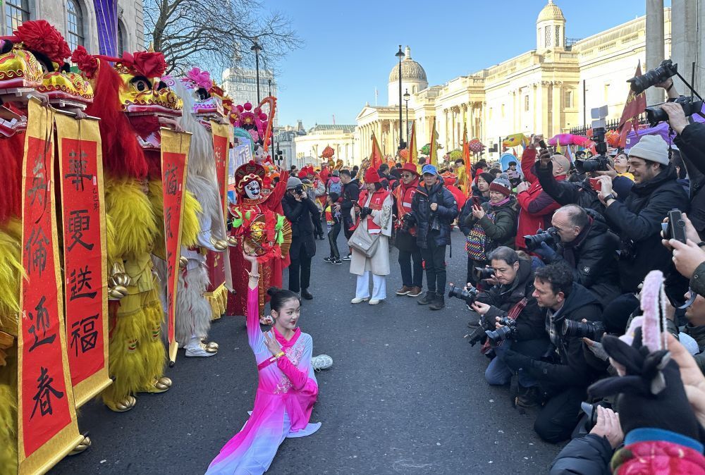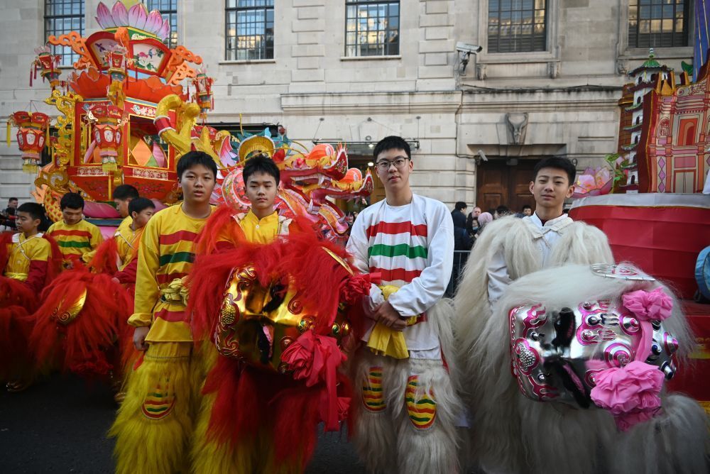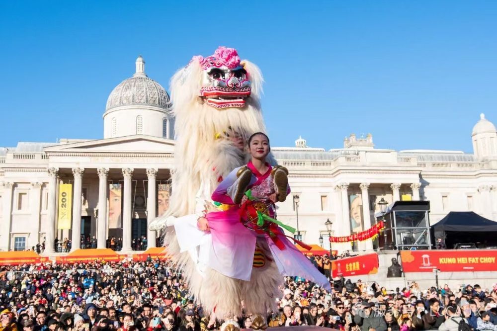 圖為在倫敦舉行的2025年“四海同春”新春文化慶典活動(dòng)上,朱浩然等隊(duì)員們表演“引獅員高臺鉗腰獅身旋轉(zhuǎn)1080度”動(dòng)作。