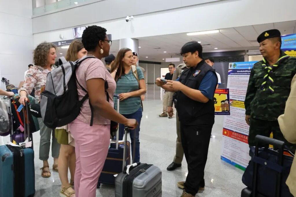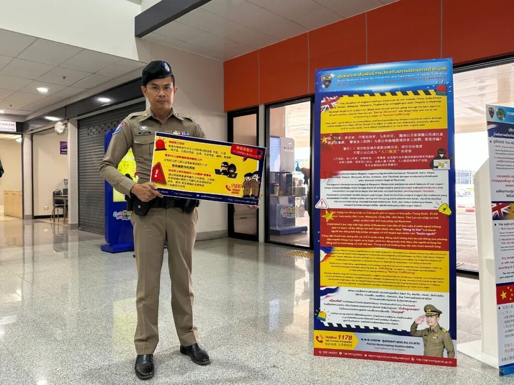 抵達(dá)湄索后記者看到,機(jī)場出口處設(shè)置了篩查中心。由泰國軍方和警方組成的檢查小組對外國旅客進(jìn)行逐一登記篩查,對來自中國、印度、印度尼西亞、馬來西亞、越南等國旅客的檢查更加詳細(xì)。泰國警察舉著寫有“警惕被騙從事非法工作”字樣的宣傳牌提醒乘客。執(zhí)勤的泰國軍方拉差瑪努特勤部隊(duì)中尉差納告訴記者:“目前抵達(dá)湄索的中國籍乘客每天10人左右,比以前的每天50—60人減少了約80%?!崩瞵斉厍诓筷?duì)隸屬納黎萱軍營,負(fù)責(zé)巡邏泰緬邊界。