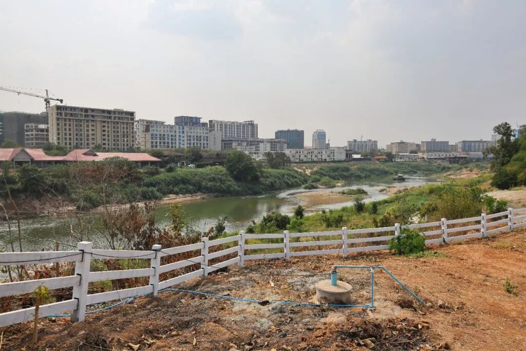 21日,記者從湄索市中心出發(fā),驅(qū)車穿越大片密集的居民區(qū)。途中街巷曲折,多處路段僅容一輛車通過。隨后,車輛駛?cè)霃V袤起伏的甘蔗田,一些農(nóng)民正忙著收割。約半個小時,記者抵達(dá)莫艾河畔。沿著邊境路段繼續(xù)行駛,每隔一段距離便能看到關(guān)卡,泰國士兵對來往車輛進(jìn)行嚴(yán)格檢查。路旁的宣傳牌上,新設(shè)的防范電信詐騙的警示信息尤為醒目。記者還幾次遇到泰國軍車沿著道路巡邏。